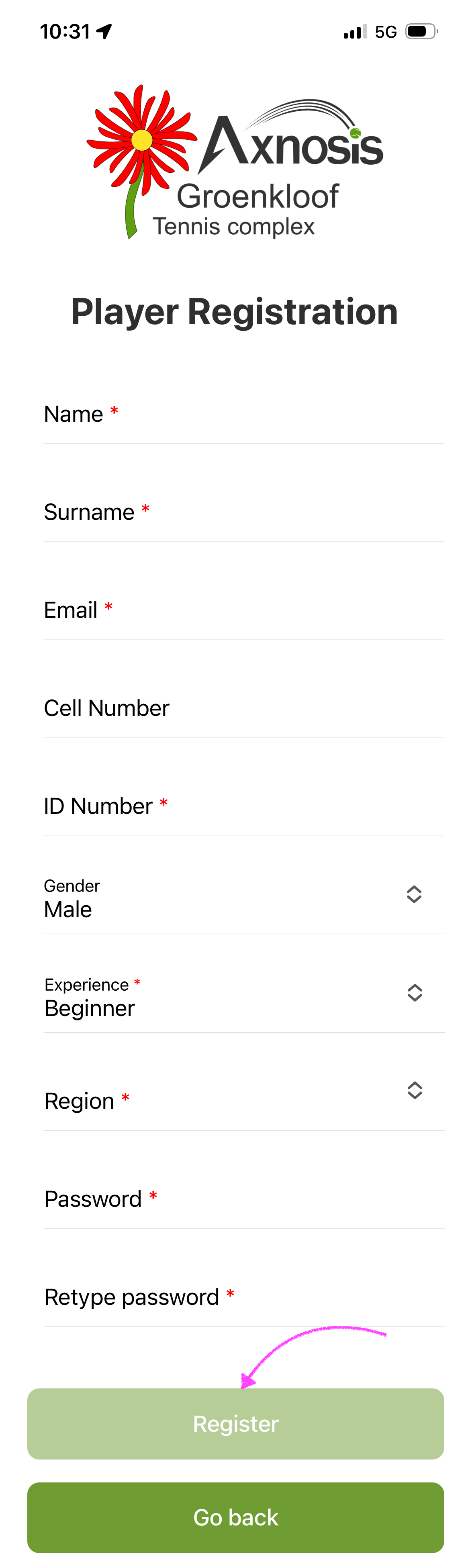 Then retype password to confirm, and tap on the Register button. Mandatory fields are indicated with